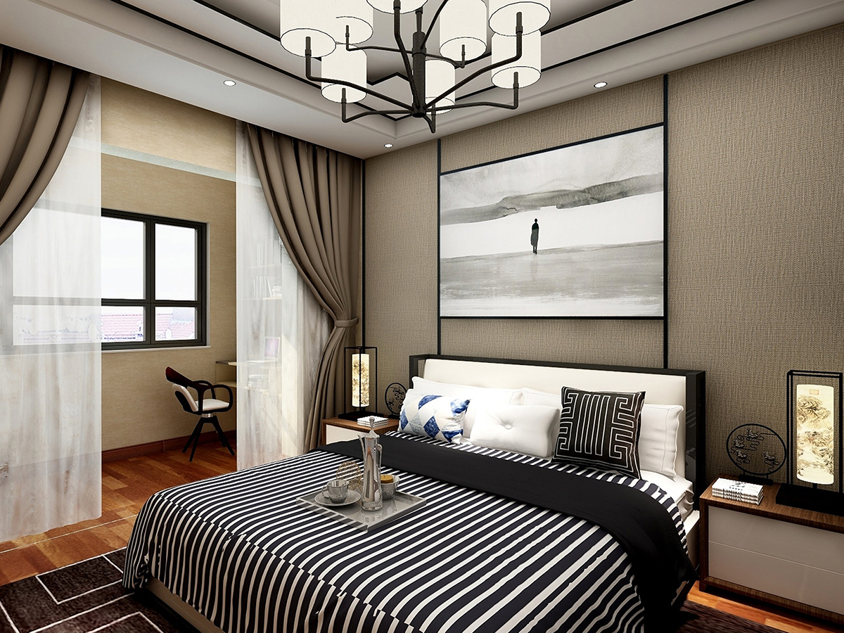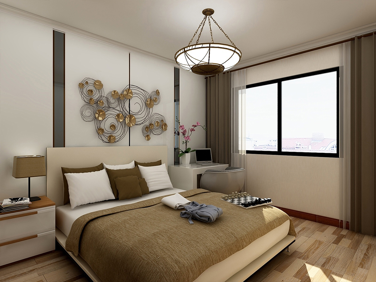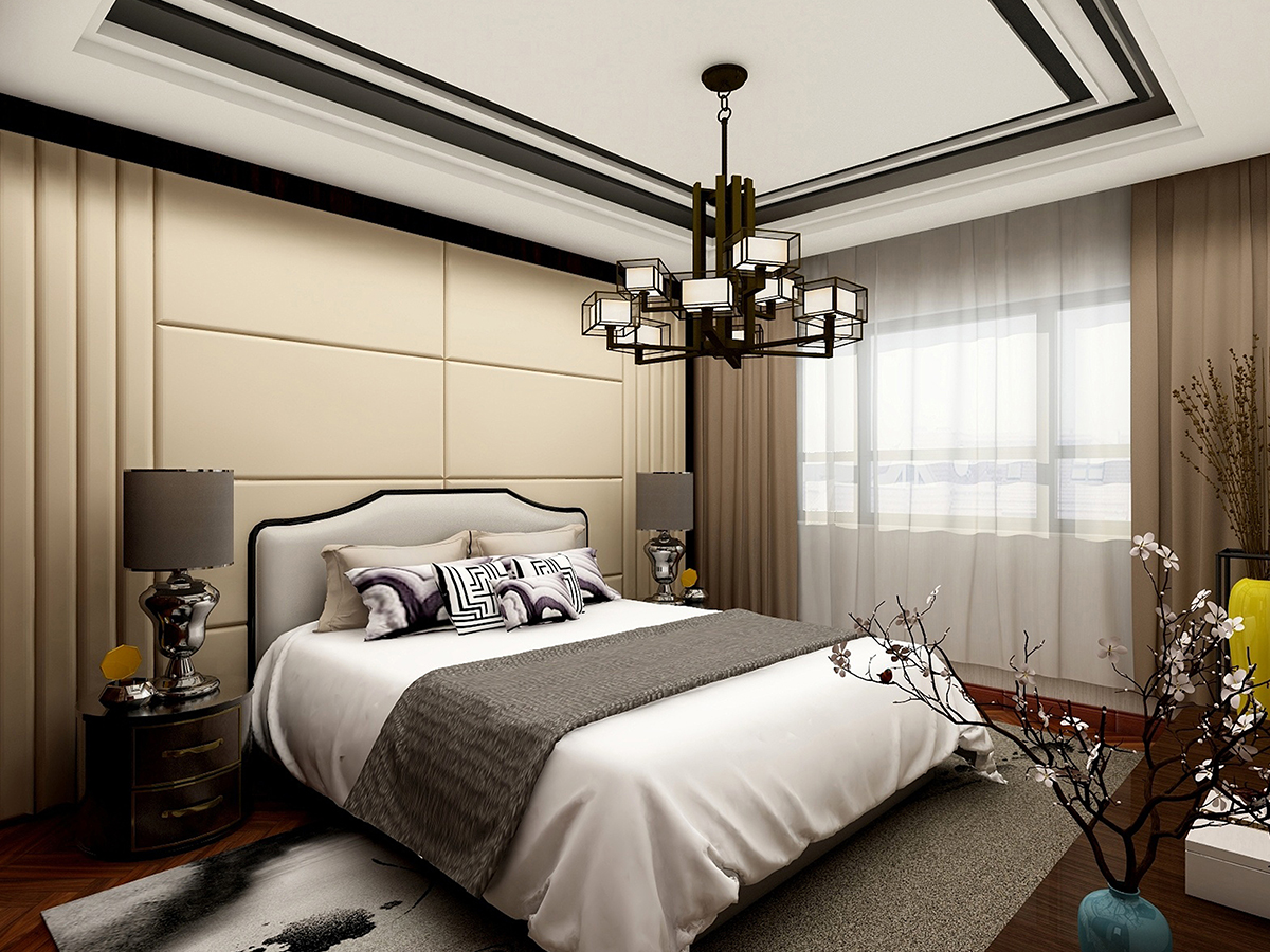 整體以現(xiàn)代中式風(fēng)格為主,既有現(xiàn)代風(fēng)格簡約、明朗的線條,又有中國傳統(tǒng)內(nèi)涵與韻味。墻面大面積使用暖色烘托整體氛圍,融洽中式與現(xiàn)代兩種風(fēng)格。