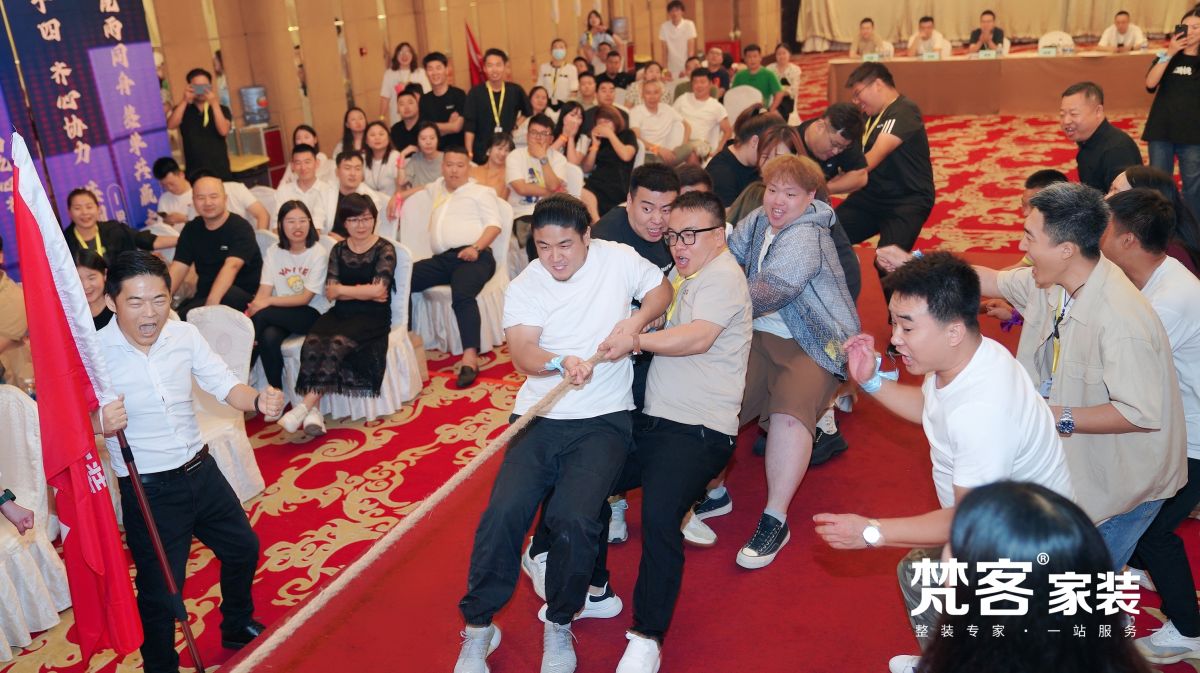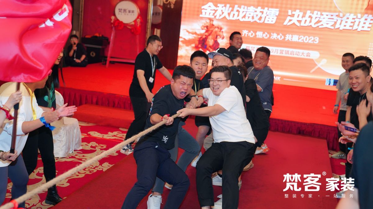 第一個項(xiàng)目是力拔山河,通俗說就是拔河。看似簡單,要想戰(zhàn)勝對手并不容易,要揣摩對方的實(shí)力、體能;在拔河的過程中也要身體核心發(fā)力,僅靠手腕的力量是遠(yuǎn)遠(yuǎn)不夠的。此外,還要團(tuán)隊(duì)集中用力,不能分散力量。關(guān)鍵是還要有一鼓作氣、一戰(zhàn)到底的決心。在這個環(huán)節(jié),梵客家裝的精英戰(zhàn)隊(duì)們各個展示了不服輸?shù)钠床瘛?/span>