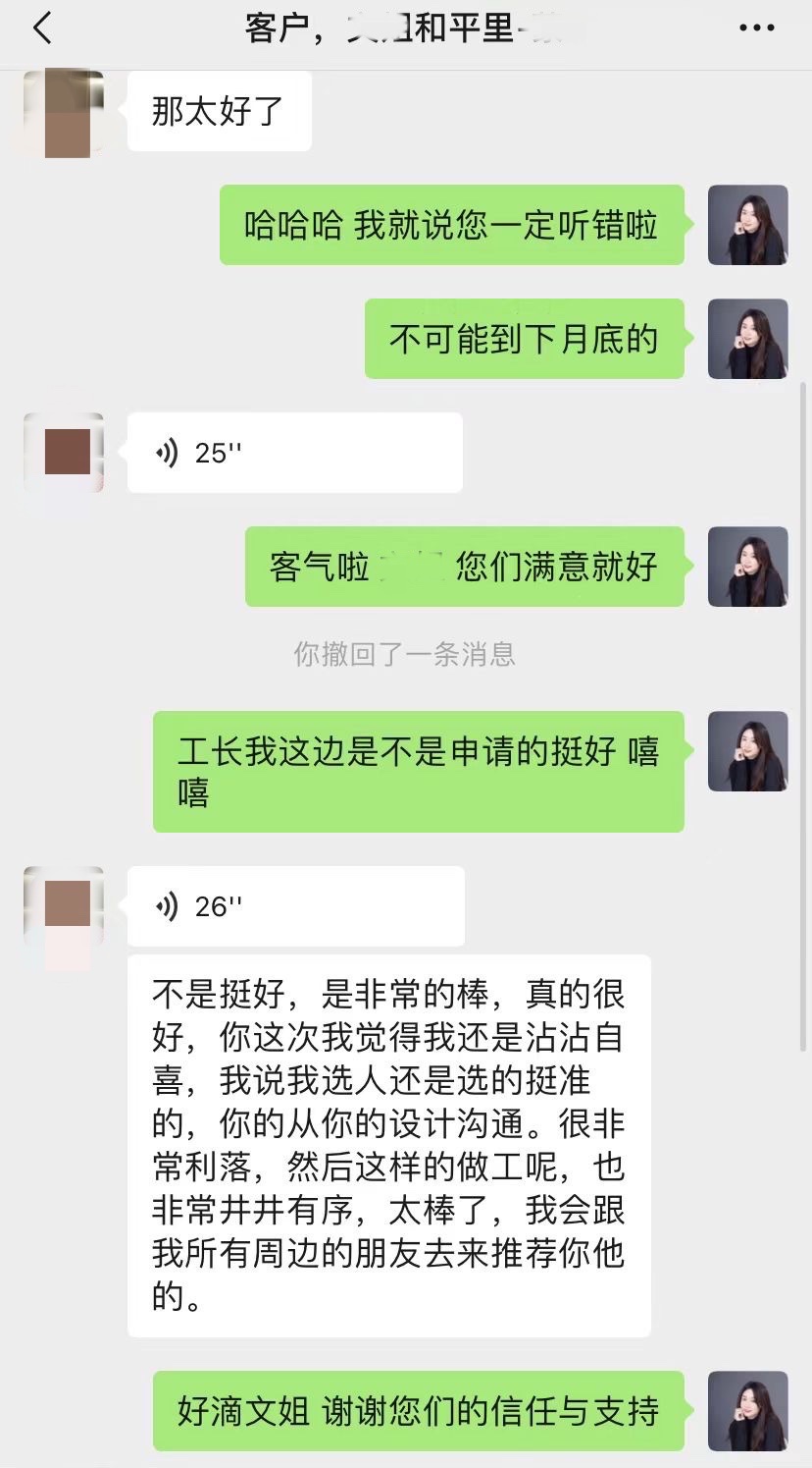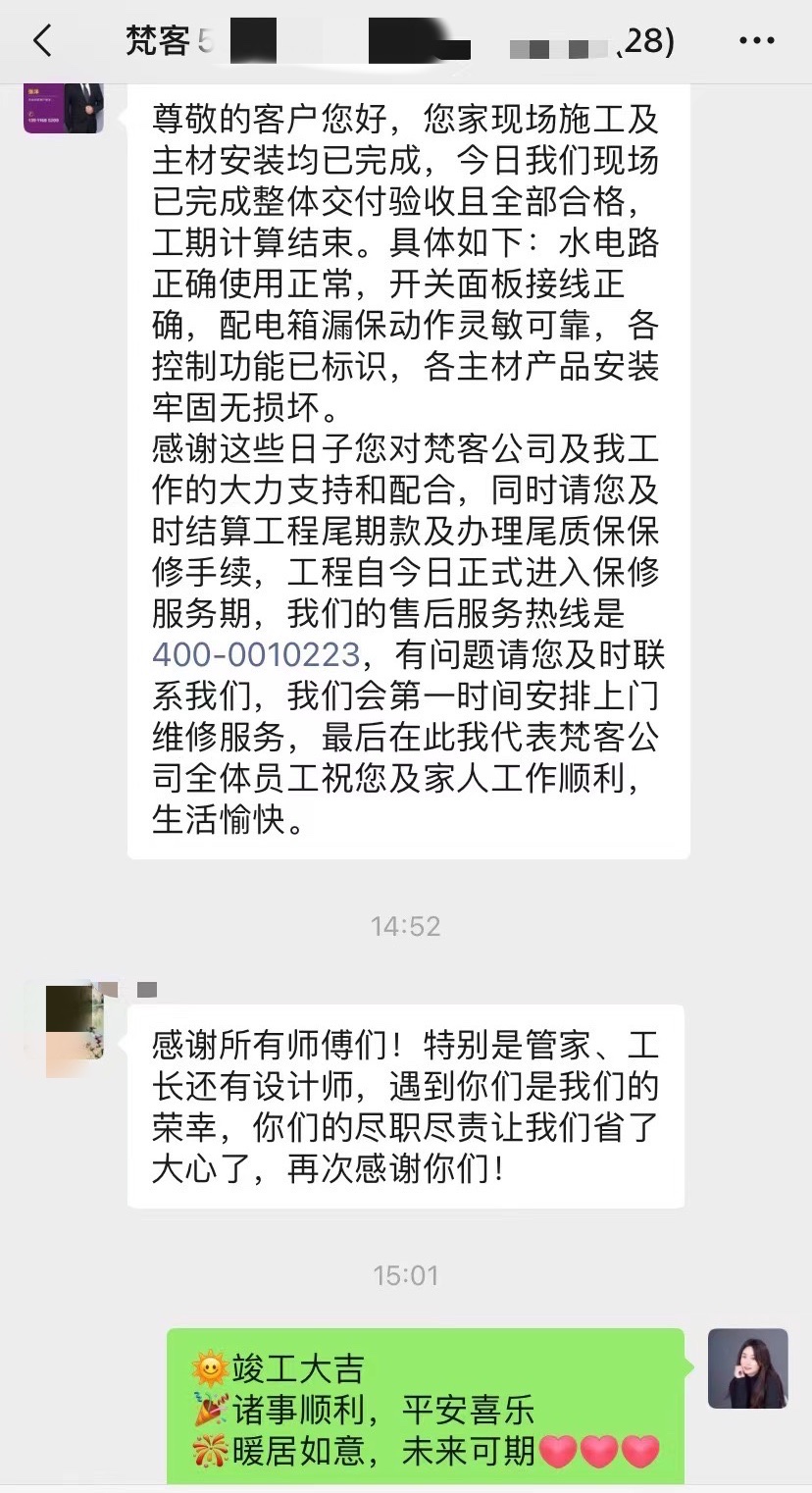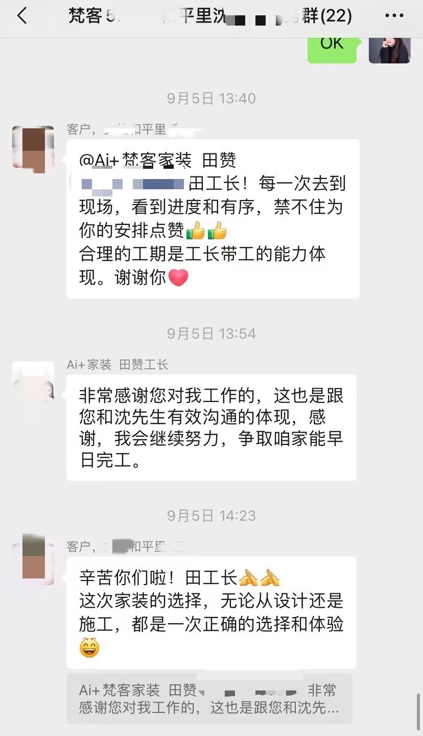 裝修階段性成果完成,管家會和業(yè)主及時溝通,以便讓業(yè)主了解到最新工作進度,做到省心放心安心。業(yè)主驗收過后,對梵客家裝、設計師、管家、工人,甚至包括材料、工人手藝、工作進度等都表示高度認可。其實,梵客家裝的工地AI化系統(tǒng),解決了業(yè)主沒時間去工地的問題,業(yè)主可以用手機隨時觀看工地情況,全方位了解自家裝修進度,遇到問題及時和設計師或工長溝通。
