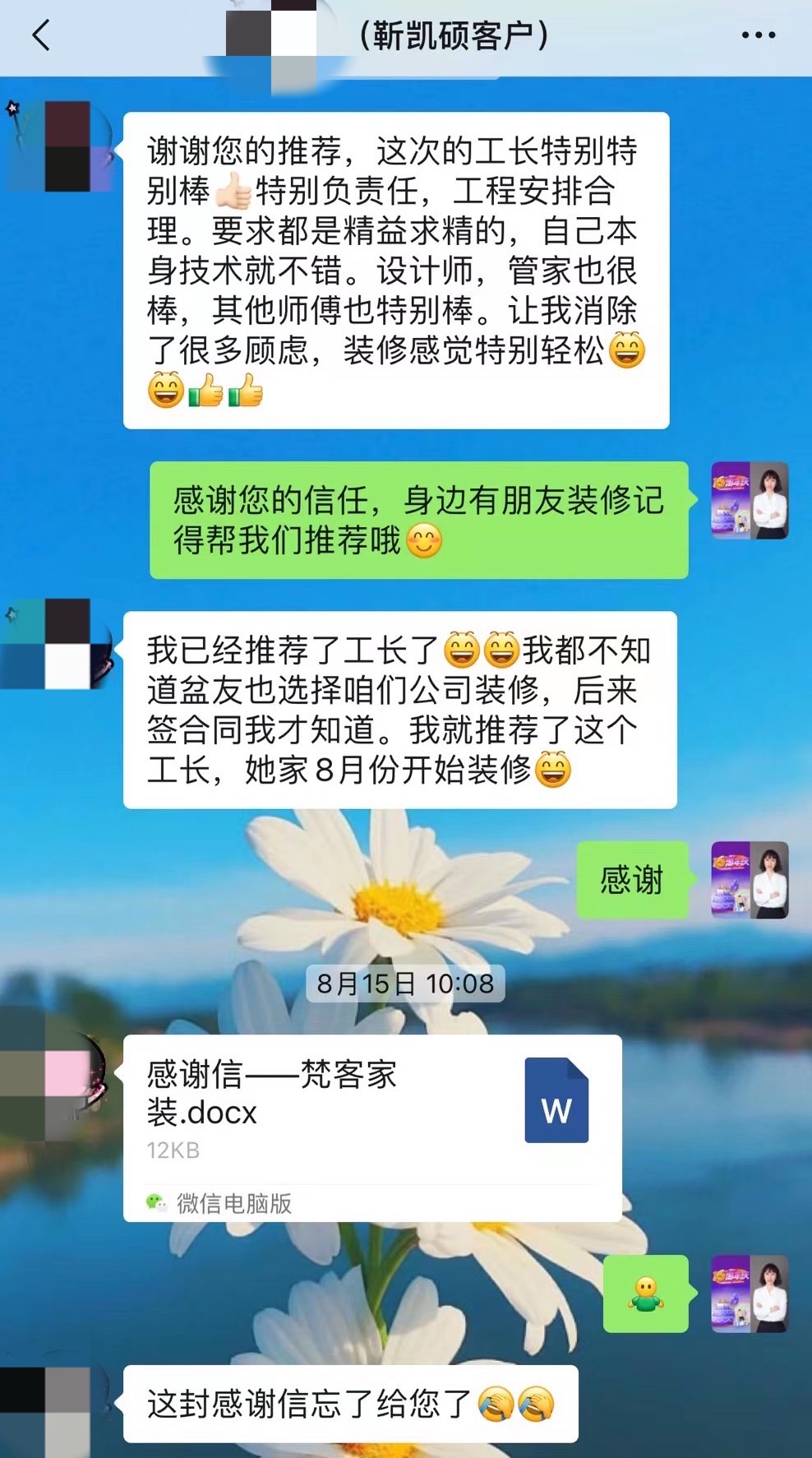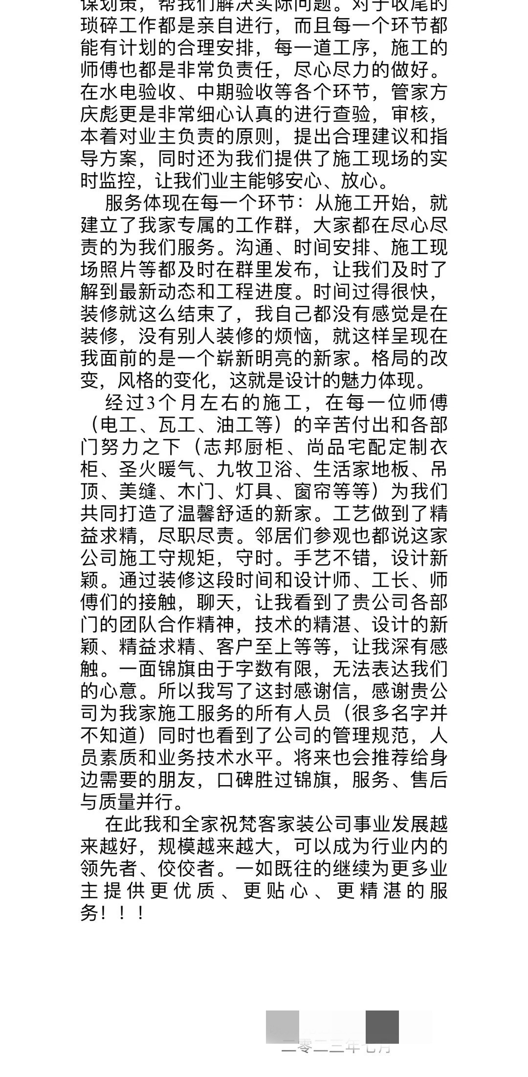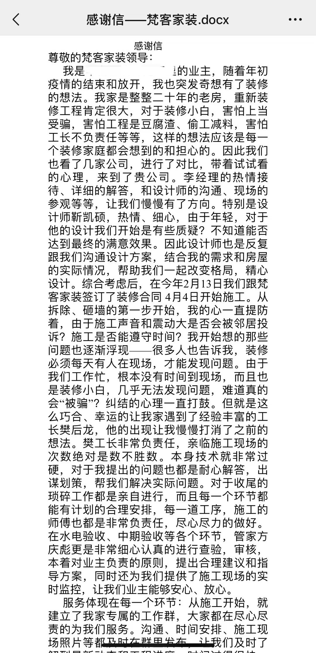 面對魚龍混雜的家裝市場,再加上對裝修行業(yè)不了解,很多業(yè)主都害怕上當受騙。這位業(yè)主抱著試一試的態(tài)度找到梵客家裝,沒想到收獲了意外的驚喜。梵客家裝的產(chǎn)品、服務都讓他感到滿意,親手寫的感謝信,不僅是對設計師的肯定,更是對公司、對整個團隊的認可。口碑相傳頌,梵客家裝在京城百姓的心目中樹立了良好的形象。能看到業(yè)主滿意入住新家,梵客家裝也由衷地感到高興。