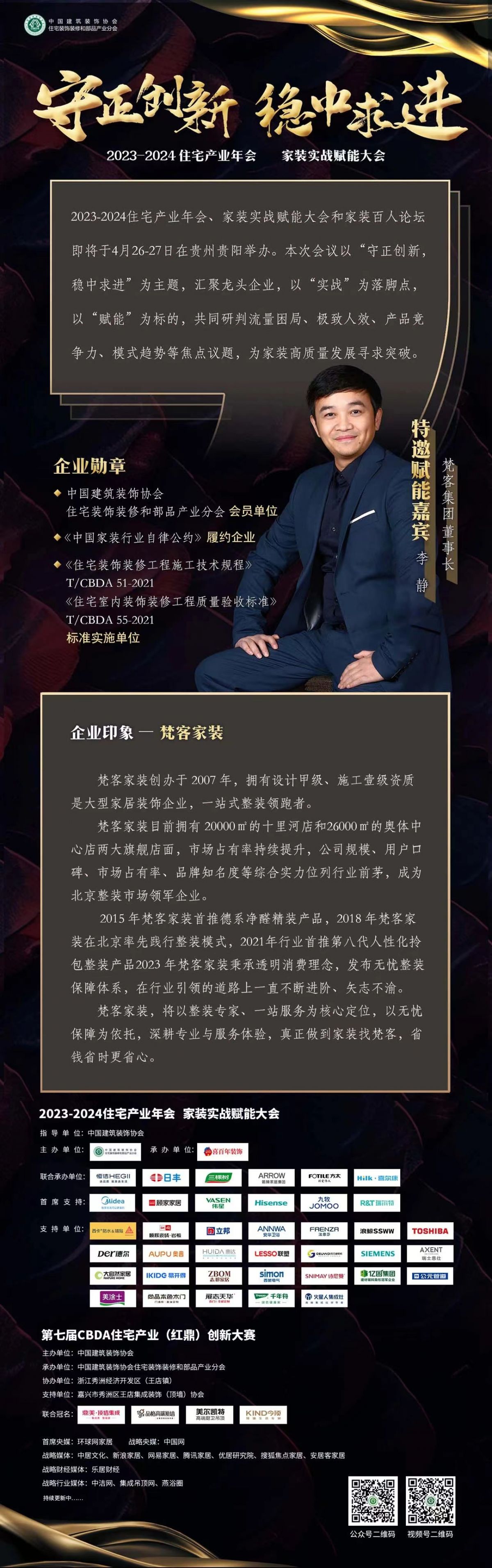 此次大會匯集全國頭部企業(yè),首次舉辦家裝百人論壇,百位家裝企業(yè)負責人圍繞流量抓手、人效提升等熱點話題,同步開講。梵客集團董事長李靜先生特邀為賦能嘉賓,將在此次大會發(fā)言。