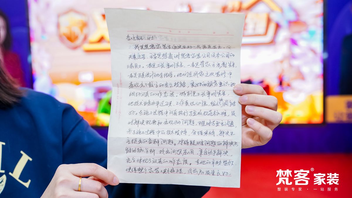 當然,也有已經裝修好的業主不辭辛苦送來錦旗,紅底金字閃爍著榮耀光芒;手寫的感謝信,一筆一劃都表達了對梵客的深情厚誼。