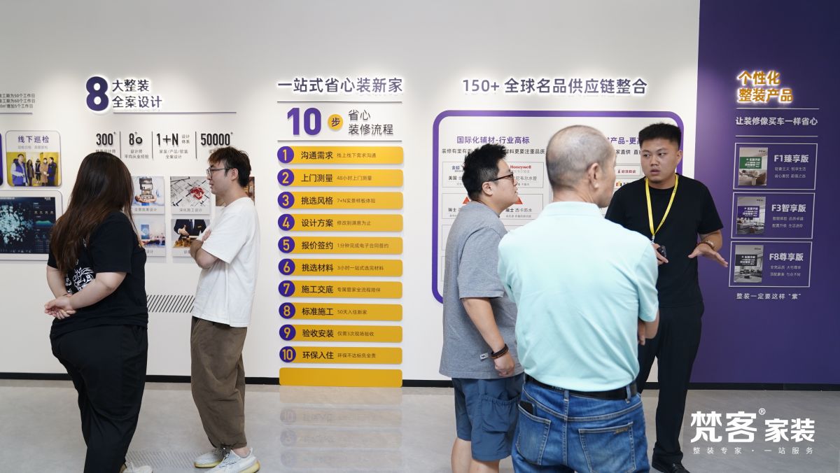 城外誠店采用更新穎的展館設計理念,共三層,設有品牌館、工藝工法區、七宅一生實景樣板間、選材區、軟裝家具展區、洽談區等場景,戰略合作150余家建材品牌,為用戶提供更豐富的選擇,不用東奔西跑,就可實現一站式整裝解決方案。輕松舒適的環境、整齊劃一的動線、琳瑯滿目的產品、匠心獨具的工藝…讓逛家裝展廳成為一種享受,也讓來梵客的業主朋友體會到賓至如歸的感覺。