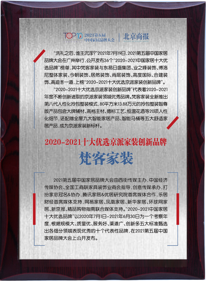 獲得【2020-2021十大優選京派家裝】創新品牌。