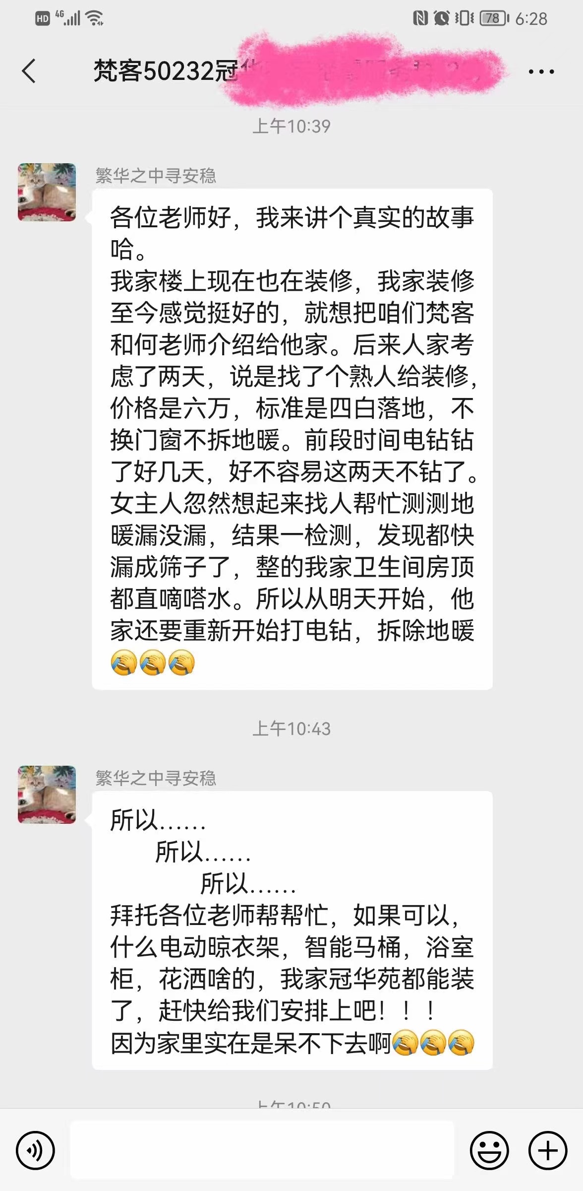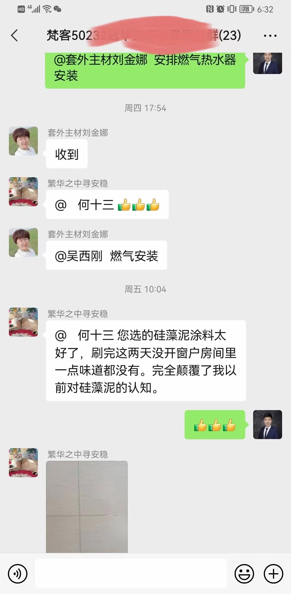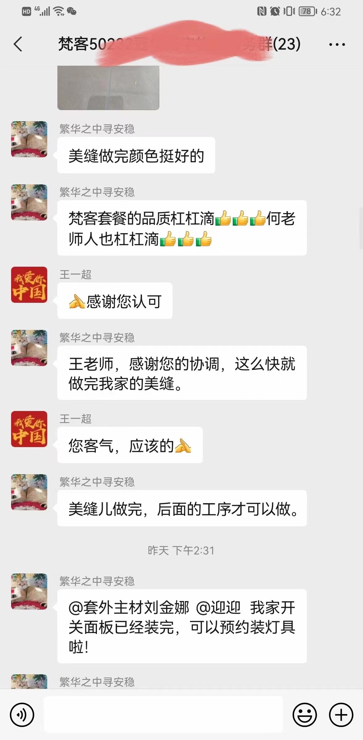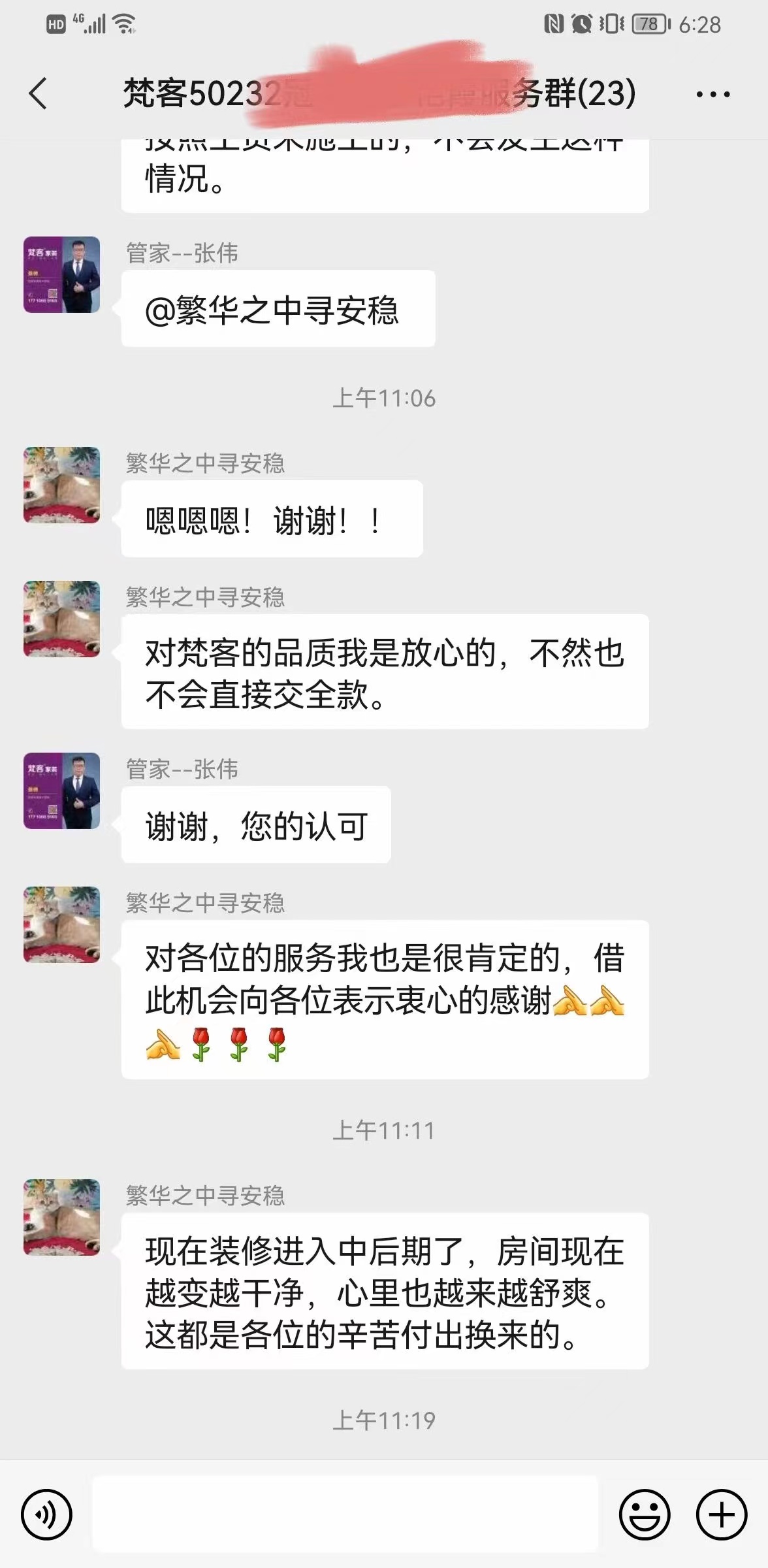 在梵客與業(yè)主的溝通群中,也能看出業(yè)主對梵客的認(rèn)可。無論在材料的選擇上,還是工藝、服務(wù)等方面,都給予很高的評價。