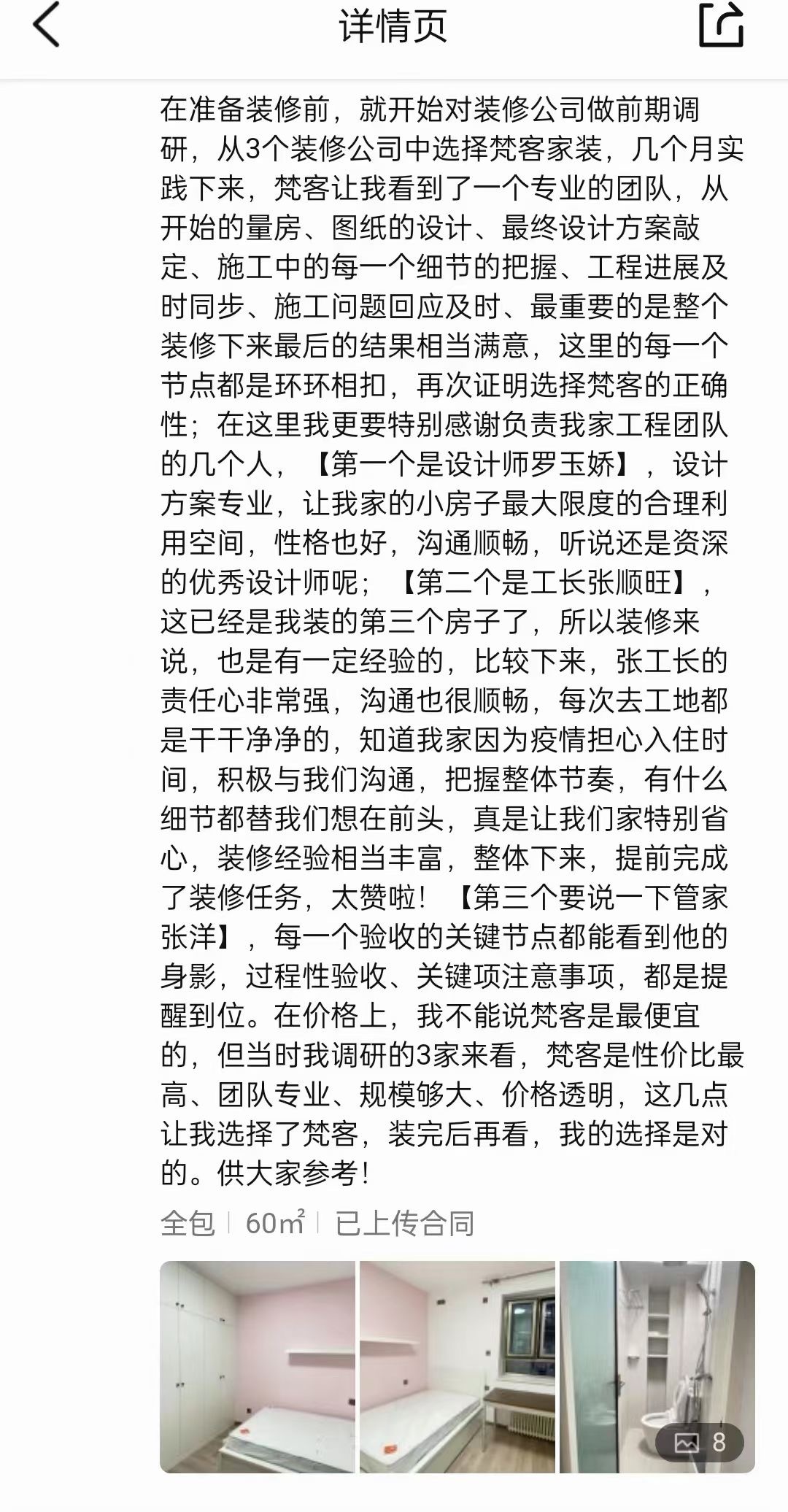 面對“消費者信賴家裝品牌”的殊榮,梵客繼續夯實服務。來看看業主的真實評價…