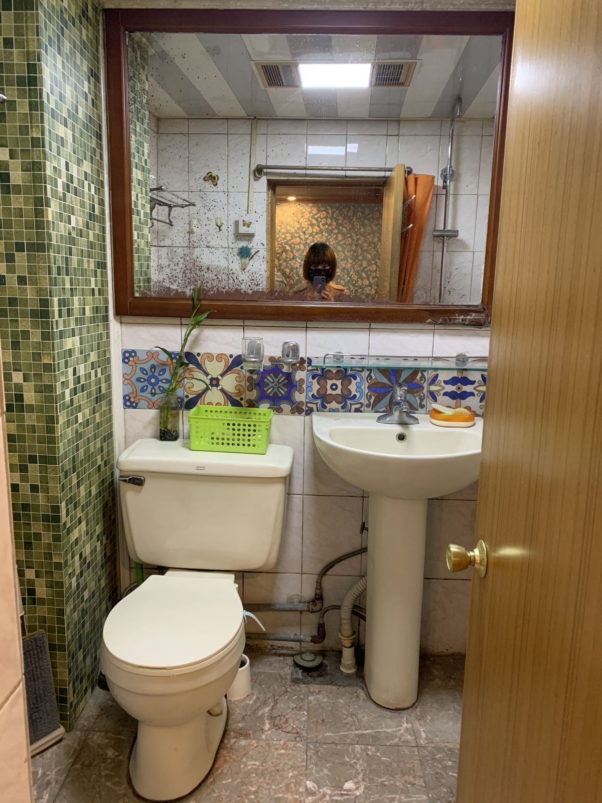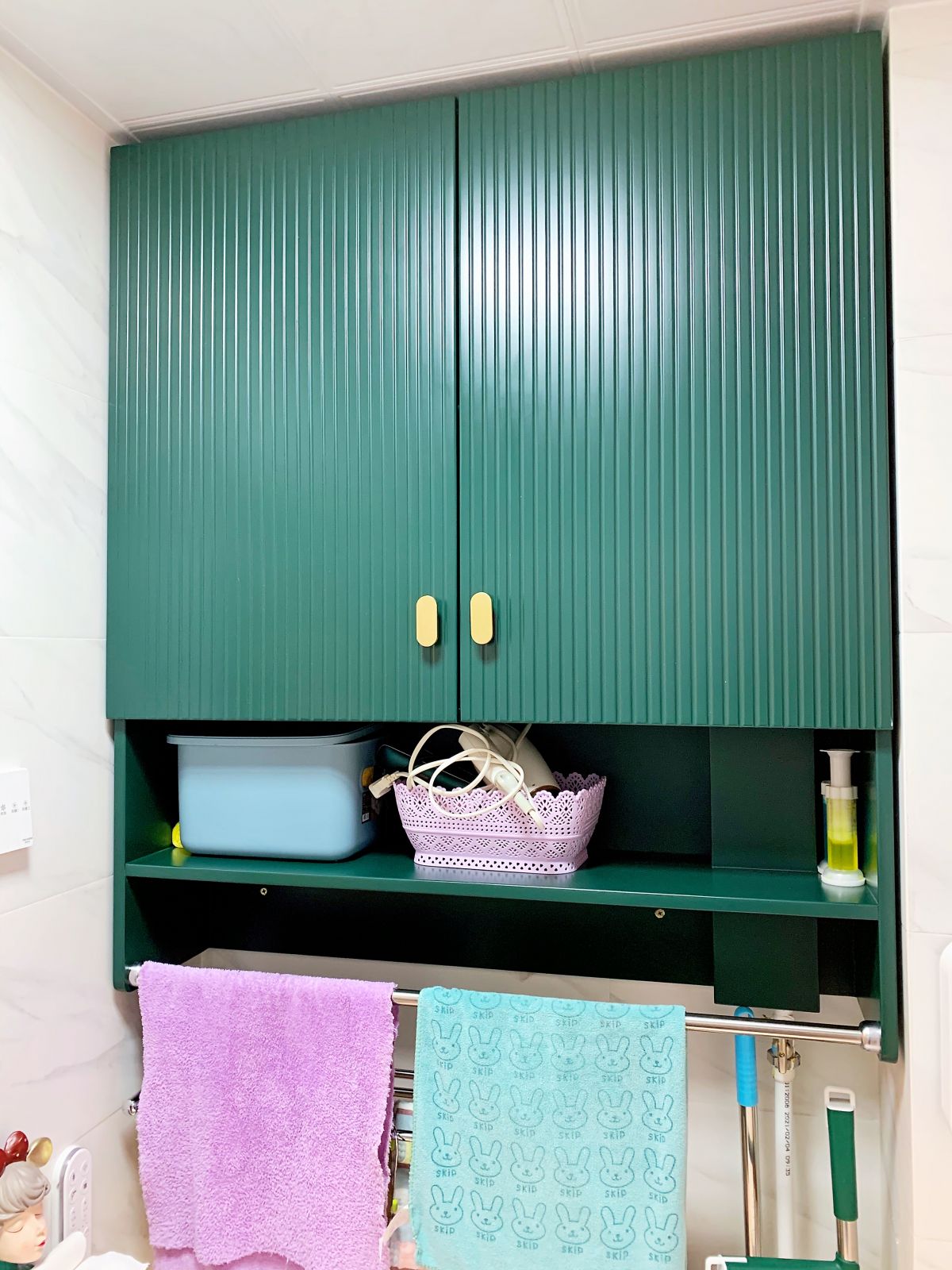 洗手間僅2.46平米,空間雖小,但每處設計都很講究。孔雀綠與櫻花粉的搭配,再加上黃銅元素的點綴,復古中融入了輕奢,簡直潮翻了。