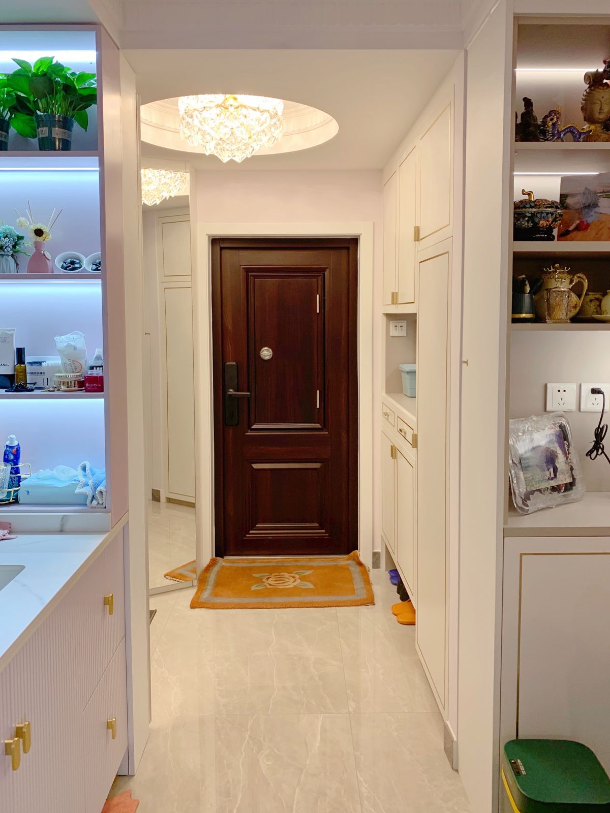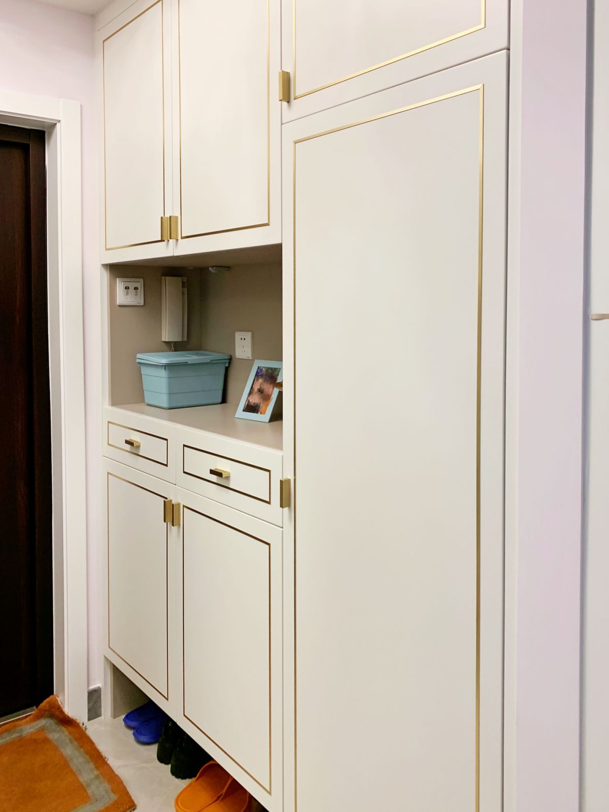 柜體中間為鏤空設計,不僅打破了大體量柜子的沉悶感,還可以放進出門隨手物品,非常方便。建議這里留備用電源,未來可增設裝飾燈或手機充電用。