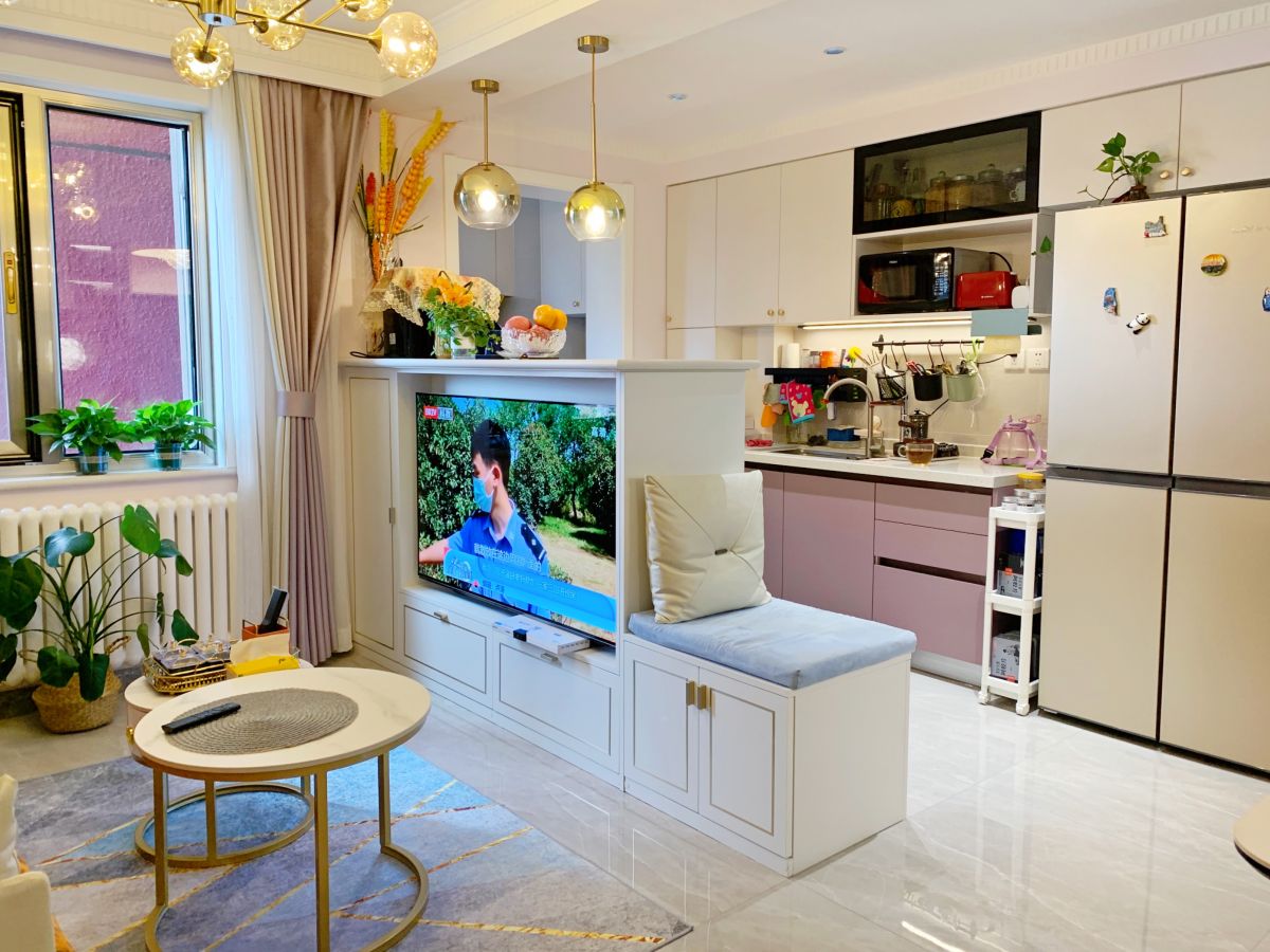 客廳與西廚之間,以半墻設計作為電視背景墻,亦是小吧臺,提升空間時尚感。既分割了兩個功能區,還多了柜子、抽屜等收納空間。