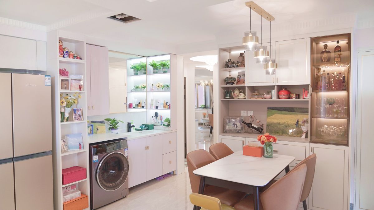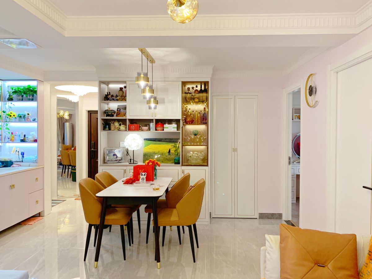 從另一個角度看,是餐廳、餐邊柜、干區。充足的展示收納格,讓一切變得井井有條,擺放著業主的照片、工藝品、旅游紀念品,這里也是生活的見證。