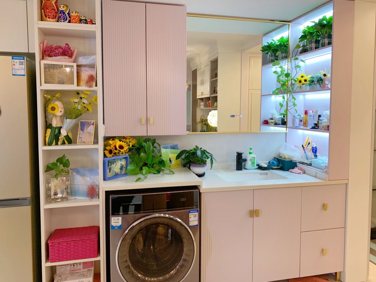 洗手盆設在廳處,更要講究顏值。量身定制,充分利用了每寸空間。米粉色的柜門,帶來浪漫的氣息。地漏做暗藏處理,保證美觀。