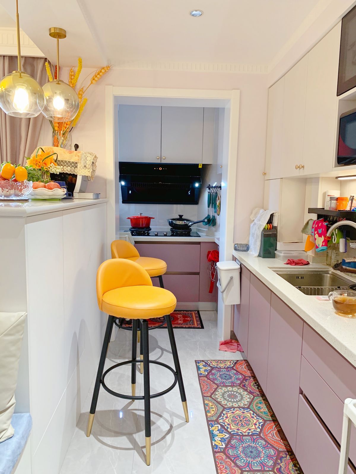 石英石的臺面,硬度高,不怕劃傷,還能耐酸堿油污。幾片花磚、粉紫色櫥柜、愛馬仕橙吧椅,為西廚小空間增加了不少異域風情,營造了閑適輕松的氛圍。