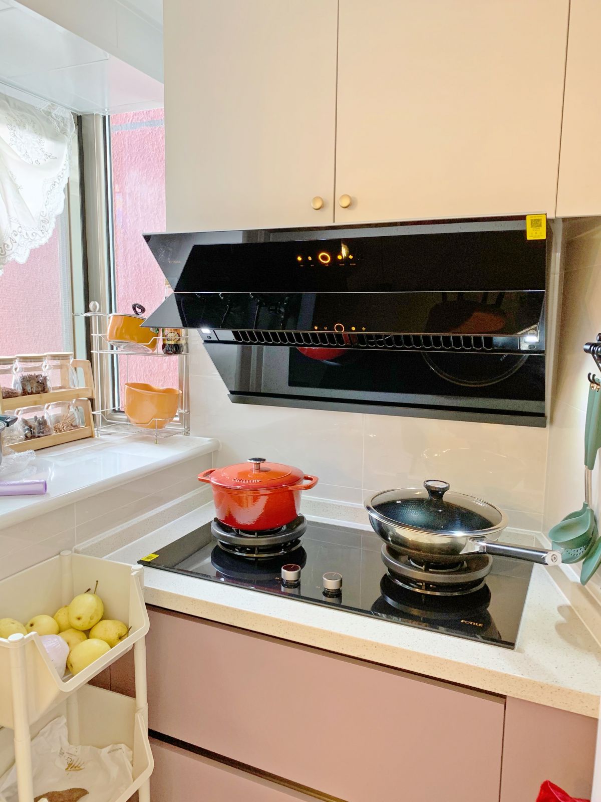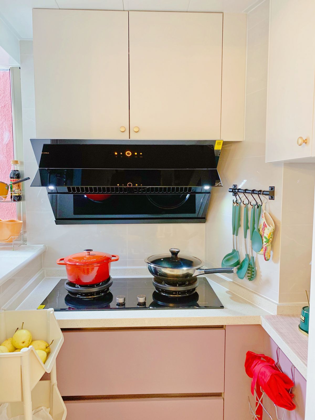 飄窗可以放調料,墻上定制掛鉤,掛鏟勺,移動籃儲放蔬菜水果。每個角落都不浪費。