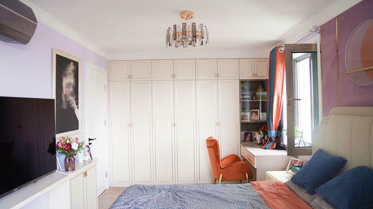 主臥則是原房型的客廳。整堵墻的定制衣柜再次升級了儲物空間,整體、大氣又美觀。