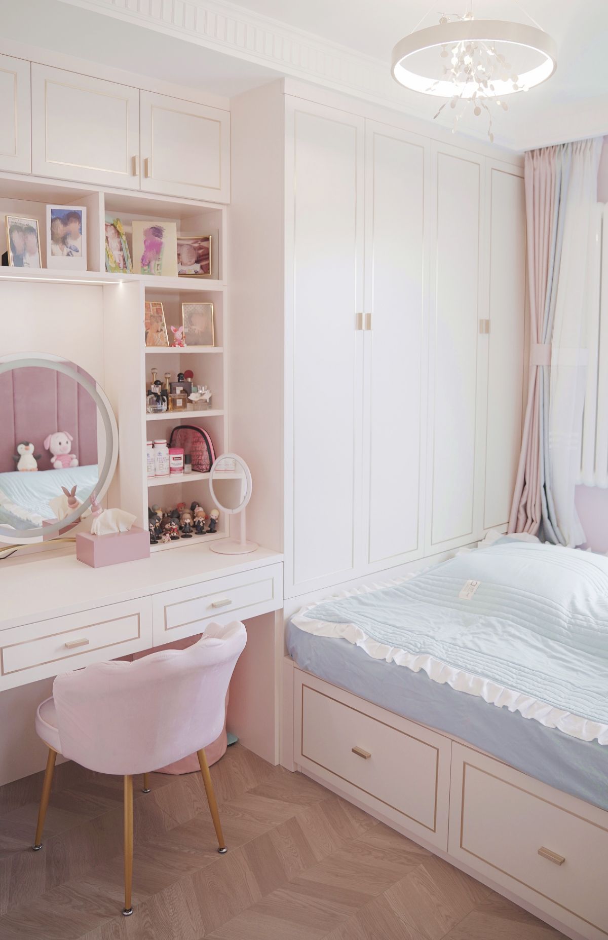 衣柜、書架、書桌/梳妝臺一體化設計,無形中,為這個小空間增加了很多功能性。