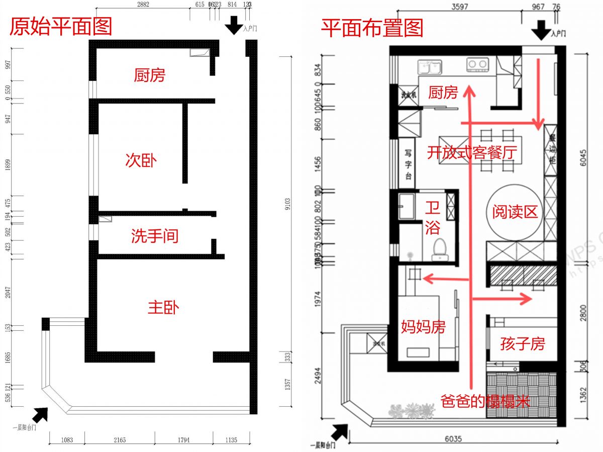 改造前,原房型以每個小空間為單位。改造后,呈現(xiàn)出客廳+餐廳+閱讀區(qū)一體化大格局,空間更通透明亮,通風透氣性更佳,滿足業(yè)主全家人一起互動的心愿。