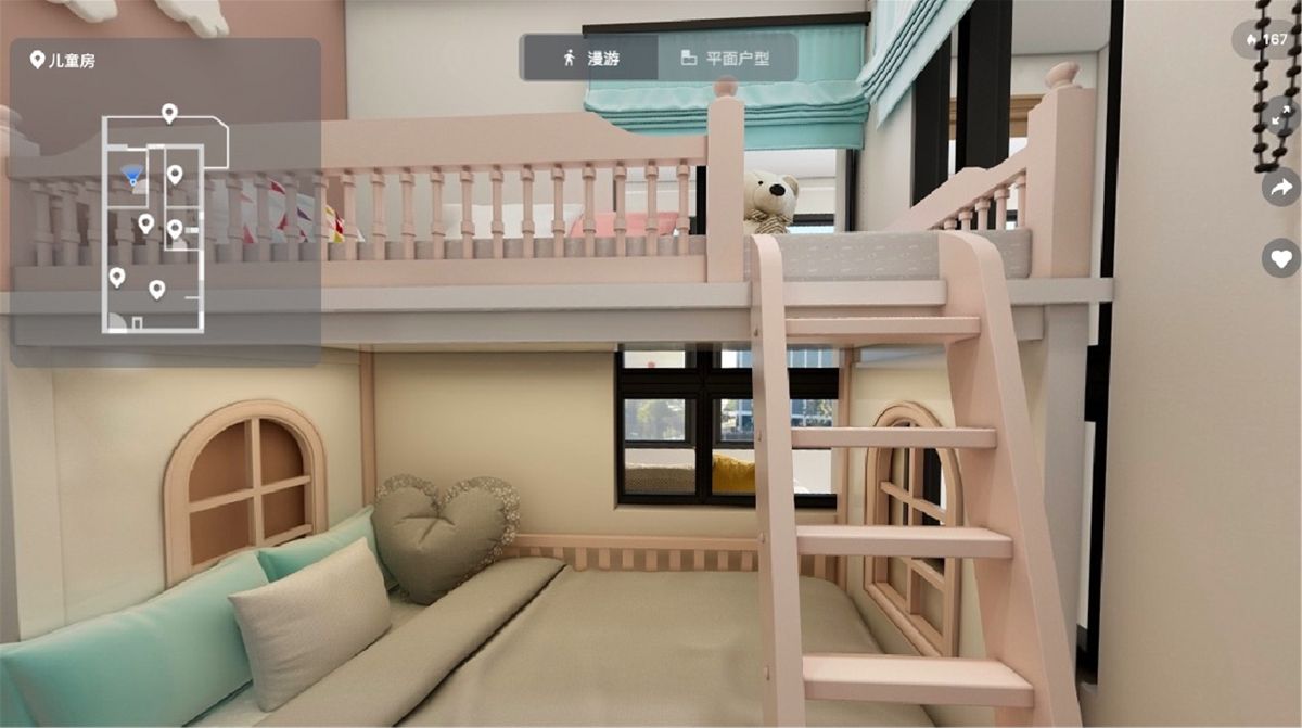 和媽媽房正對的是小朋友的房間,這兩個區(qū)域都由原來的主臥改成。因為是雙胞胎女兒,所以特別設(shè)計了上下鋪,保證兩個孩子獨立的睡眠空間,彼此互不影響。