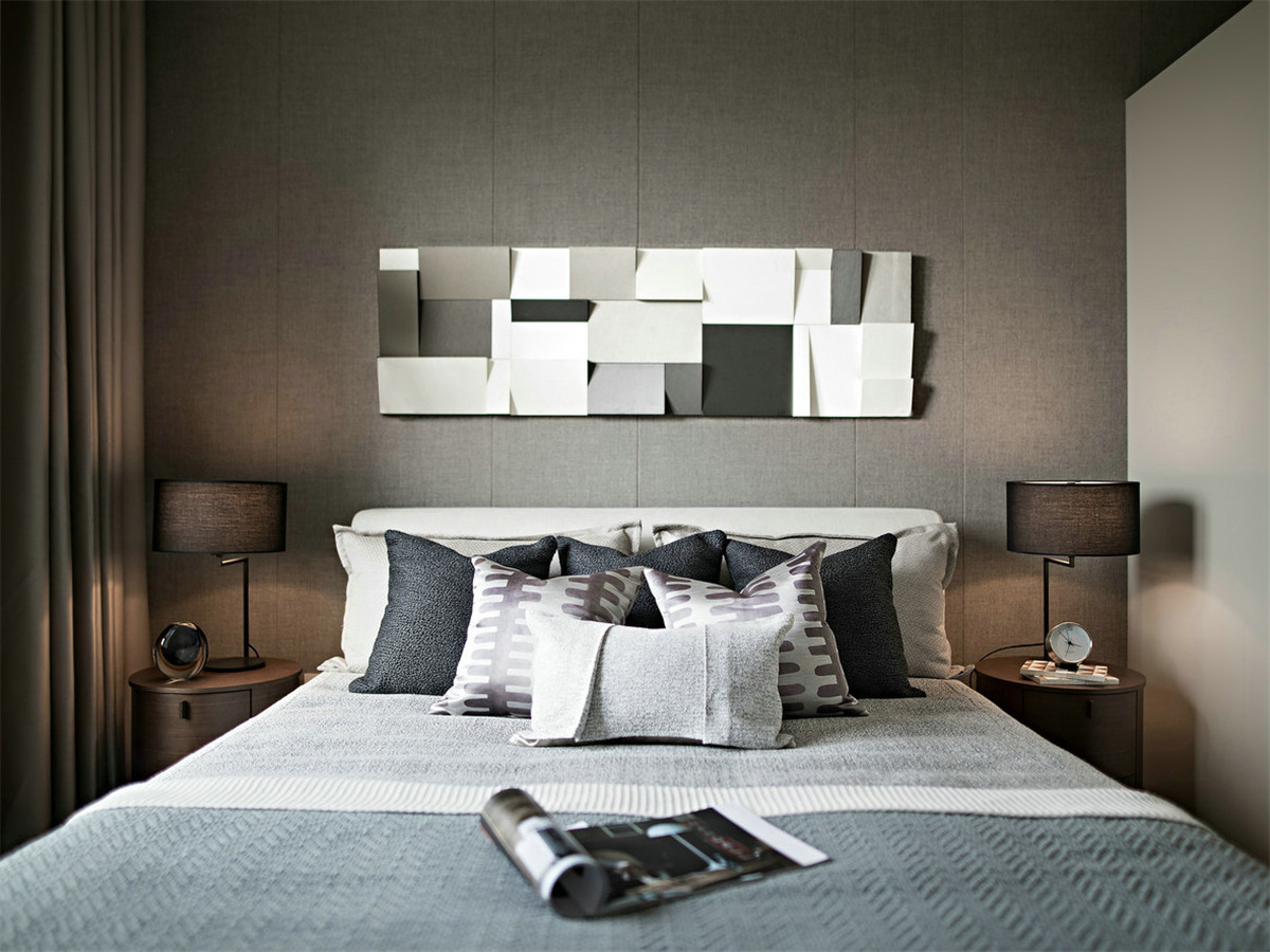 主臥的設計主要是圍繞著都市風尚,整個空間凸顯品位與現代感,飾物的造型干凈利落,灰色調高貴雅致,深淺不一的抱枕增加了空間層次感。整個臥室都顯得柔軟舒適。