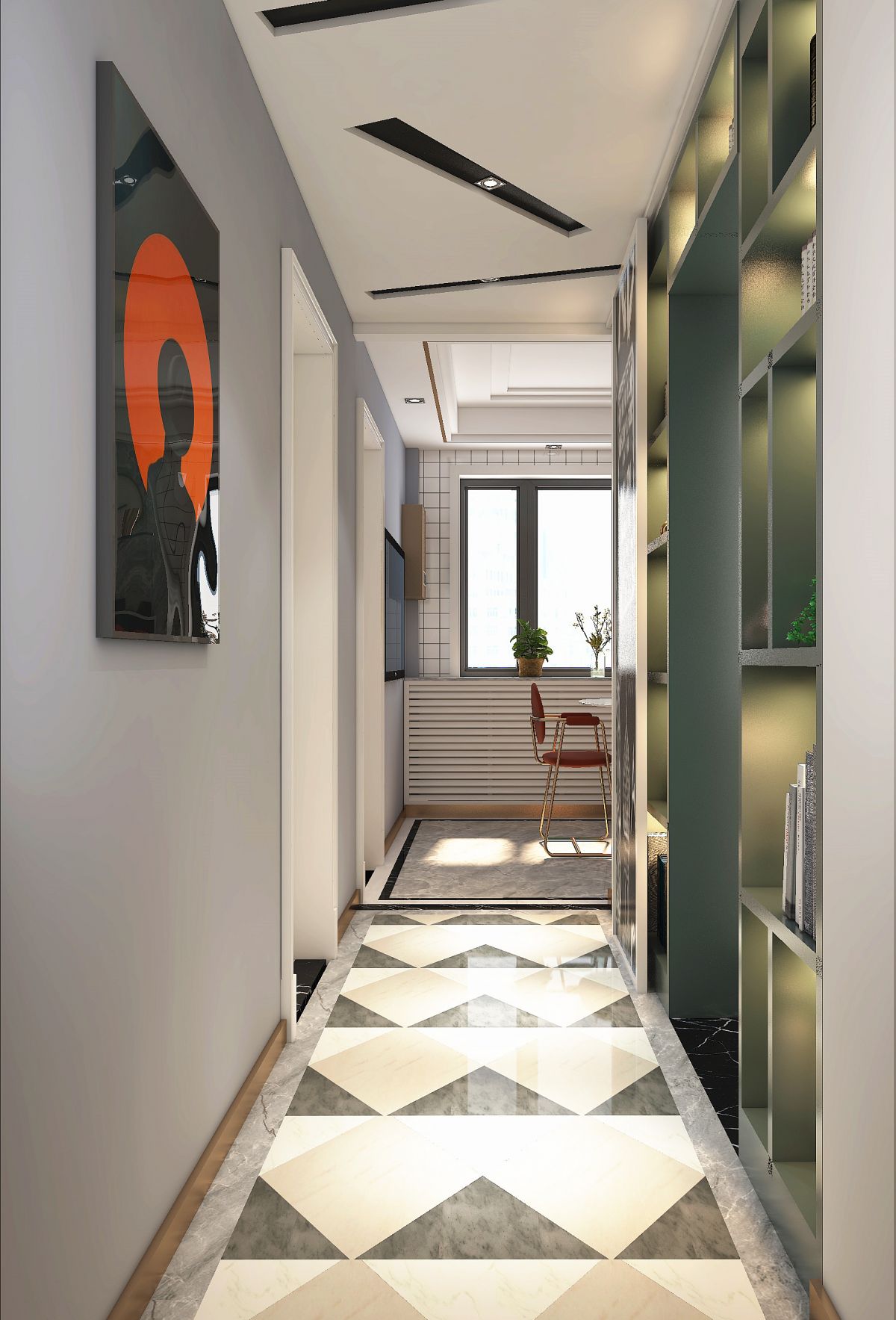 廊廳采光不佳,書柜內(nèi)設燈光照明,不僅讓這個小區(qū)域光彩奪目,也方便平日拿取書籍。幾何圖形的地磚時尚又閃亮,現(xiàn)代輕奢風若影若現(xiàn),反射出的光源也為空間增加了一絲亮度。